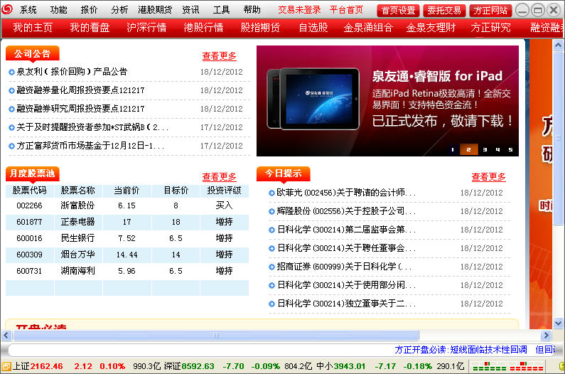 10、更多特色资讯:主页股市百宝箱汇集方正证券研究所最优秀的投资研究成果、方证资讯、弹出公告、滚动资讯、市场雷达,第一时间推送最有价值的市场资讯。