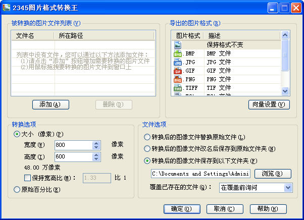 2.目前支持图片转换的格式有:BMP JPG GIF PNG CUR TIF TGA PCX WBMP WMF JP2 JPC PGX RAW SKA。