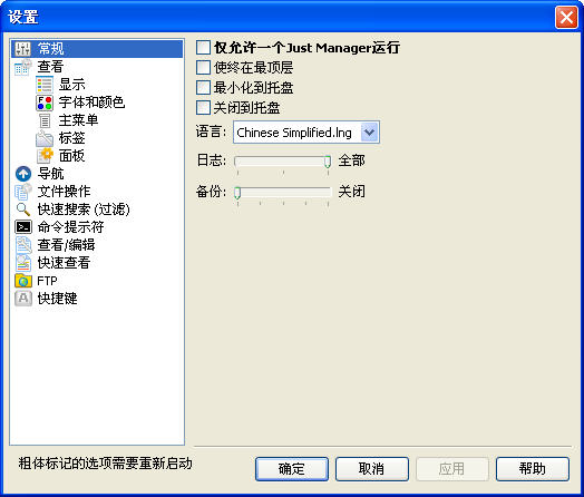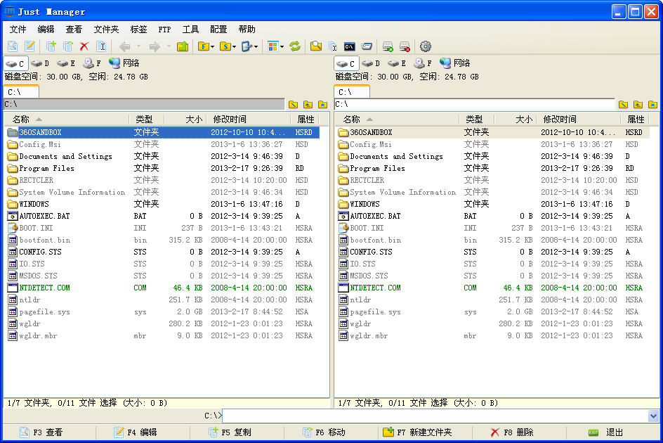 多页面文件管理(Just Manager)体积很小,运行快速。虽然迷你,但是在功能方面一点也不含糊,包含了很多高级文件管理器带有特性,比如多面板、标签页功能、工具栏中显示所有分区和常见命令的图标,并且还带有中文界面也可以安装成绿色版。