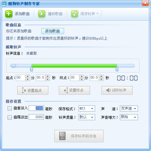 1、启动铃声制作工具后,先点击“添加歌曲”,添加一首本地音乐文件(选硬盘上你要截取的歌曲mp3)