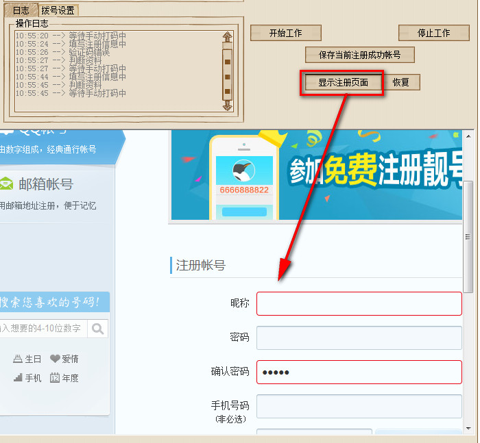 2、设置完成后,单击开始工作,我们可以看到下面的操作日志,还可以看到注册页面的内容上密码已填好。