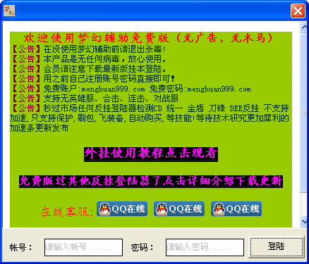 1.过登陆器:轻松过掉市场最新反挂登陆器,比如:猎鹰反挂、统一云端反挂、金盾反挂、DEE反挂、LEG CD反挂、3KM2合击反挂 等市场任何牛逼反挂登陆器。我们做到第一时间更新!