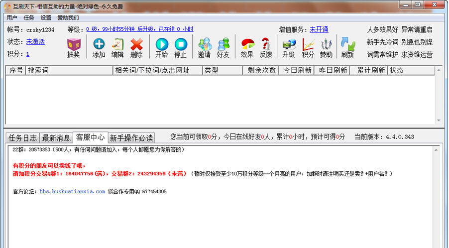 当您挂机运行软件时,软件会自动点击别人的任务。点击一次,您会得到1个积分。当您添加任务后(挂机运行的情况下时),您的任务会自动分配给其他用户去点击。被点击一次扣掉1个积分。 积分仅仅只是一个凭证,积分就像一个国家的金融体系,官方不能随意发行、赠送和官方交易买卖。如果滥发积分。就会导致通货膨胀,就会贬值。直接后果就是大家都没效果。 所以我们为了建立起一个公平公正互助合作的一个平台是非常不容易的。请大家贡献自己的点滴。珍惜机会。