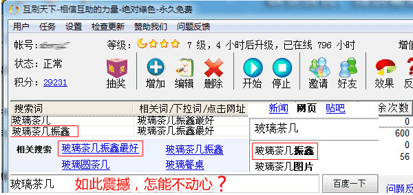 点击相关搜索和下拉时是完全不用担心您的网站被K的问题。软件点击的是您的相关的词,跟您的网站毫无关系,同时我们也严格控制点击速度,在搜索引擎正常的范围内点击。 使用的人越多表示越是正常行为。更多的人在搜索相关关键词。 另外软件刷新慢这个问题,我们也是严格按照搜索引擎的最大记录有效数据的极限来设计的,同时:软件上的增加积分的数字不是实时刷新的。所以大家看上去很慢,如果做到实时刷新,我们的服务器承载能力更加有限的。
