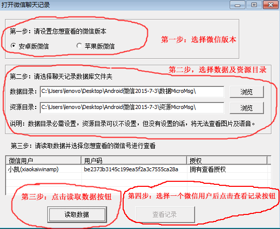 2,打开“楼月微信聊天记录导出恢复助手”软件,选择微信版本,然后设置好相应目录,点击“读取数据”按钮,然后软件会将目标文件夹中的微信号读取出来,点击想查看的微信号后再点击查看按钮即可。