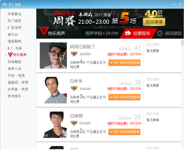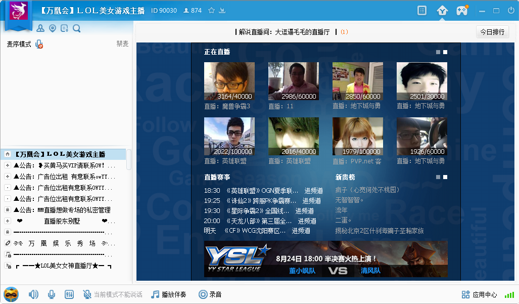 YY语音自开通直播间以来,加入了很多网络红人,例如:YY人气王赵小磊加入,突破担任专场10万人巅峰记录!后期Mc地主、李先生、Mc暴徒、Mc大灵的加入,使YY人气更上一层楼!聪明、随意、自我。