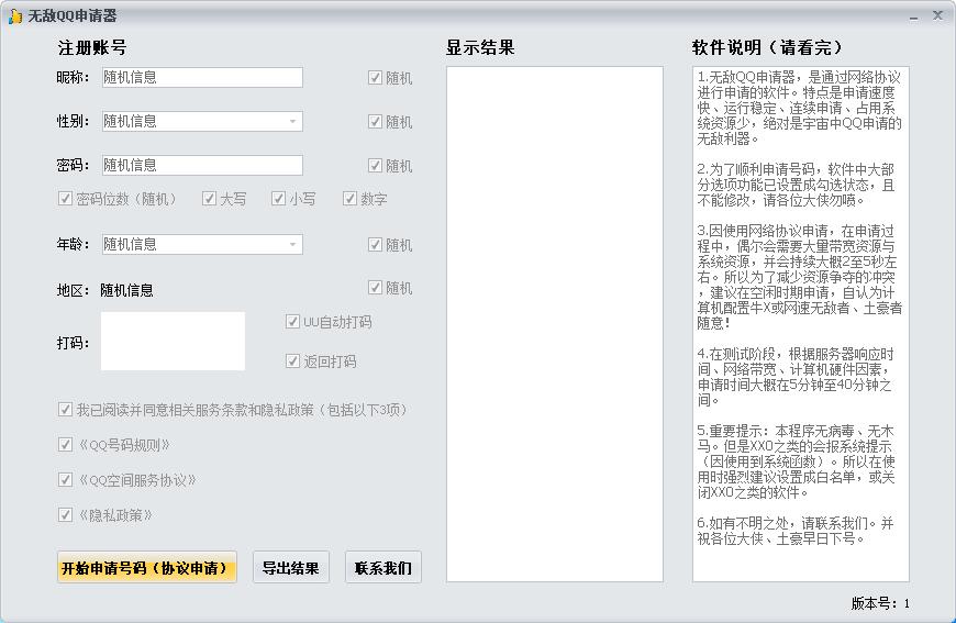 2.为了顺利申请号码,软件中大部分选项功能已设置成勾选状态,且不能修改,请各位大侠勿喷。