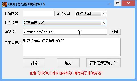 QQ封号与解封软件,可实现本地电脑上的QQ号的封号与解封,可用来保护自己的QQ号,不被恶意攻击盗号非法利用等,也可以用来搞恶作剧,软件绿色无毒,无捆绑广告