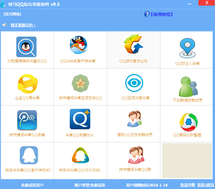 快马QQ综合采集软件采用网络账号形式,一个软件账号可以在不同电脑登陆,用户可以在家使用,也可以在公司使用,摆脱了传统软件采用机器码形式的弊端,真正意义上实现了以用户为中心,以服务为根本的营销理念。