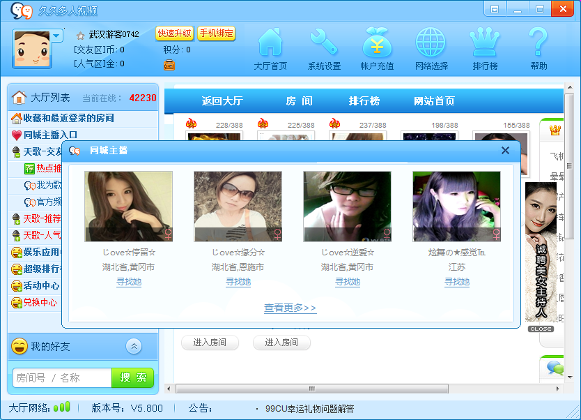 用户可随心进入用户房间进行视频游戏交友。