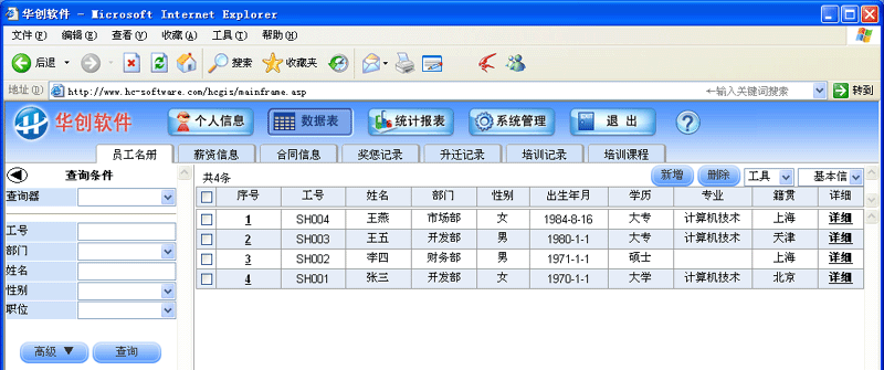 华创人事薪资管理系统是一款可管理员工名册、员工薪资、劳动合同、奖惩记录、培训课程、培训记录等各种信息,可作灵活的统计和分析,具有自动提醒功能。与同类其它软件相比,最大特点是可自由调整、自由扩展!
