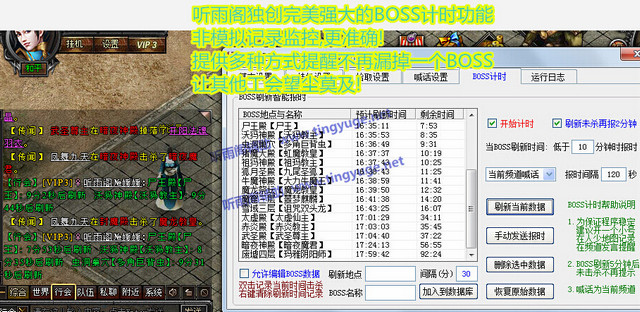 听雨阁魔龙诀辅助是听雨阁辅助网针对热门页游《魔龙诀》而制作的免费绿色辅助工具,辅助具有自动挂机,自动副本,快速买药,快速传送,BOSS智能计时提醒等功能,辅助最大的功能是具有独创完美强大的BOSS计时,提供多种方式提醒不再漏掉一个BOSS让其它工会望尘莫及,本插件可以代替玩家操作,省下时间与精力,带来更好的游戏体验。