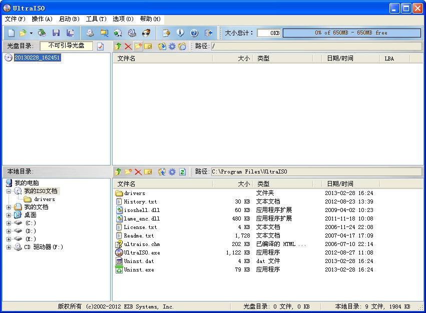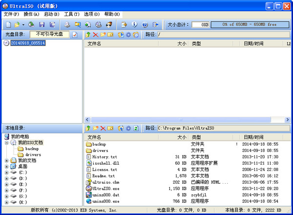 方法:新建ISO文件,将文件或目录从界面下方的“本地”浏览器拖放到上方的“光盘”浏览器,最后保存就可以了。
